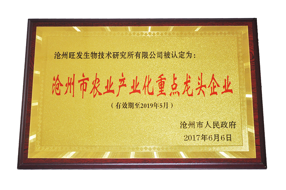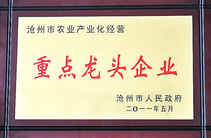 滄州(zhōu)市(shì)農業產業化重點龍頭企業(yè)證書